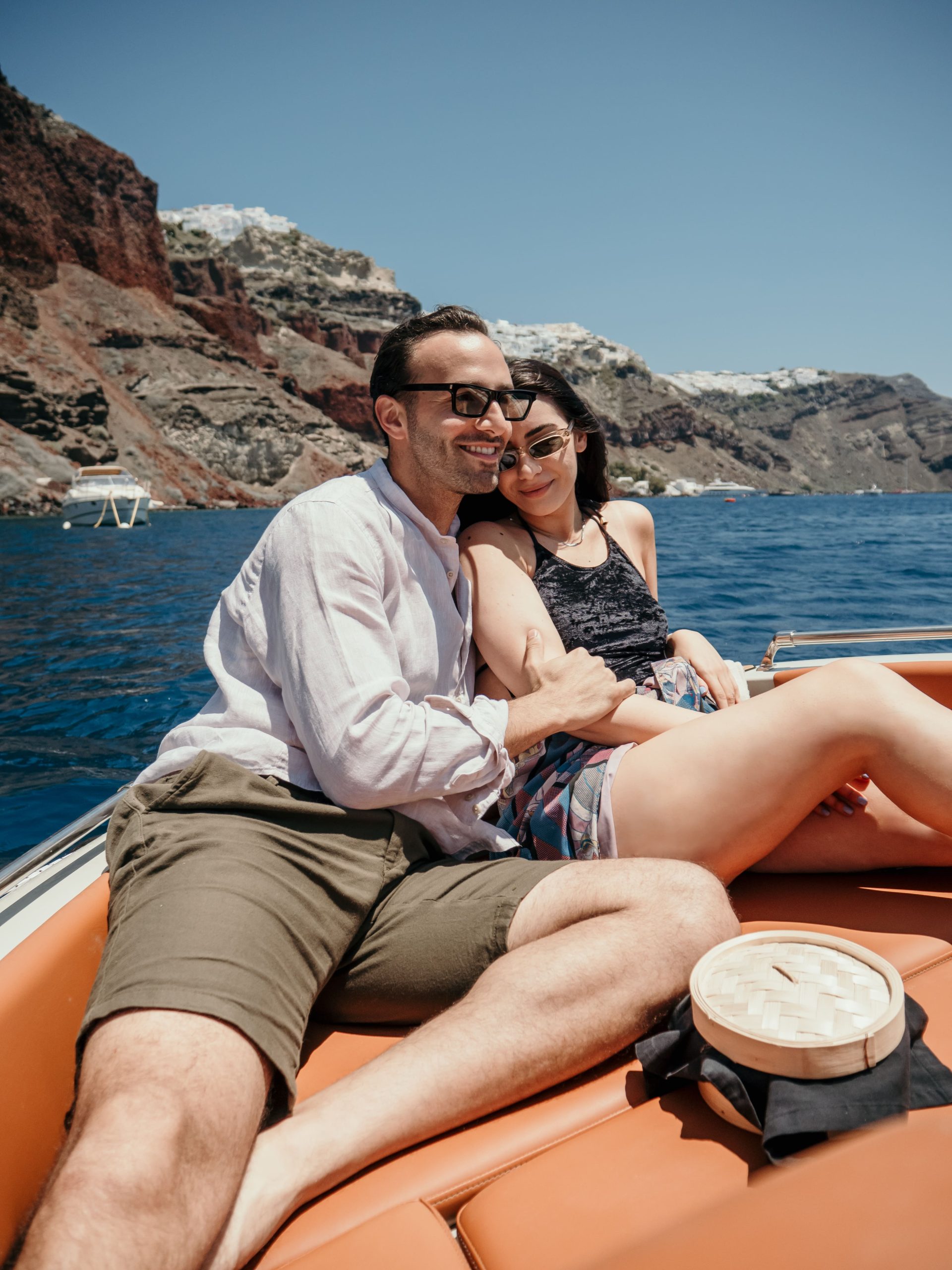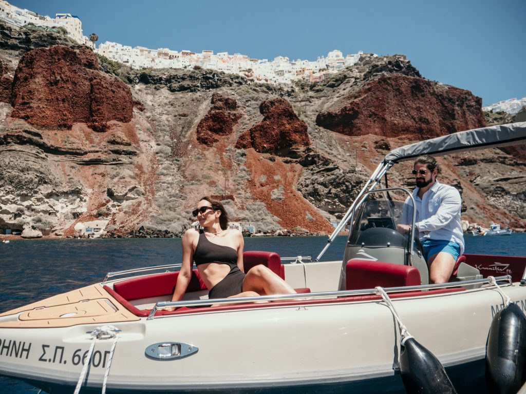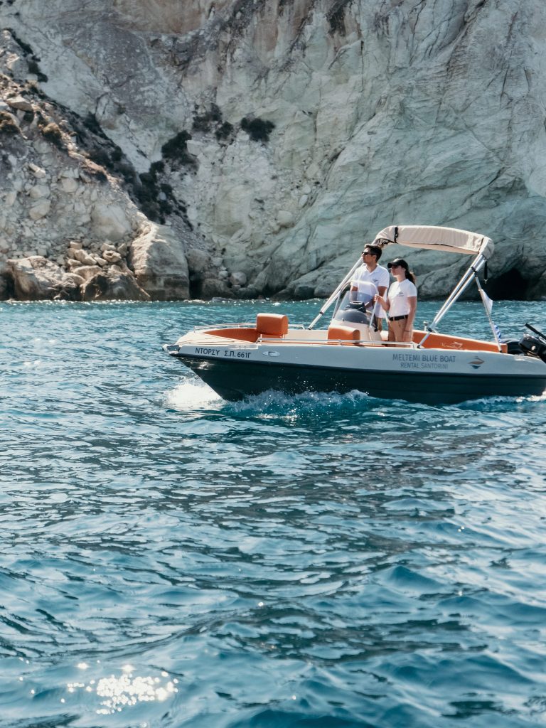 We offer brand-new boats built in 2023, fully equipped with the latest electronic and mechanical technology, including GPS and safety tracking systems. No boating license is required – you can simply be your own captain and explore Santorini at your own pace.